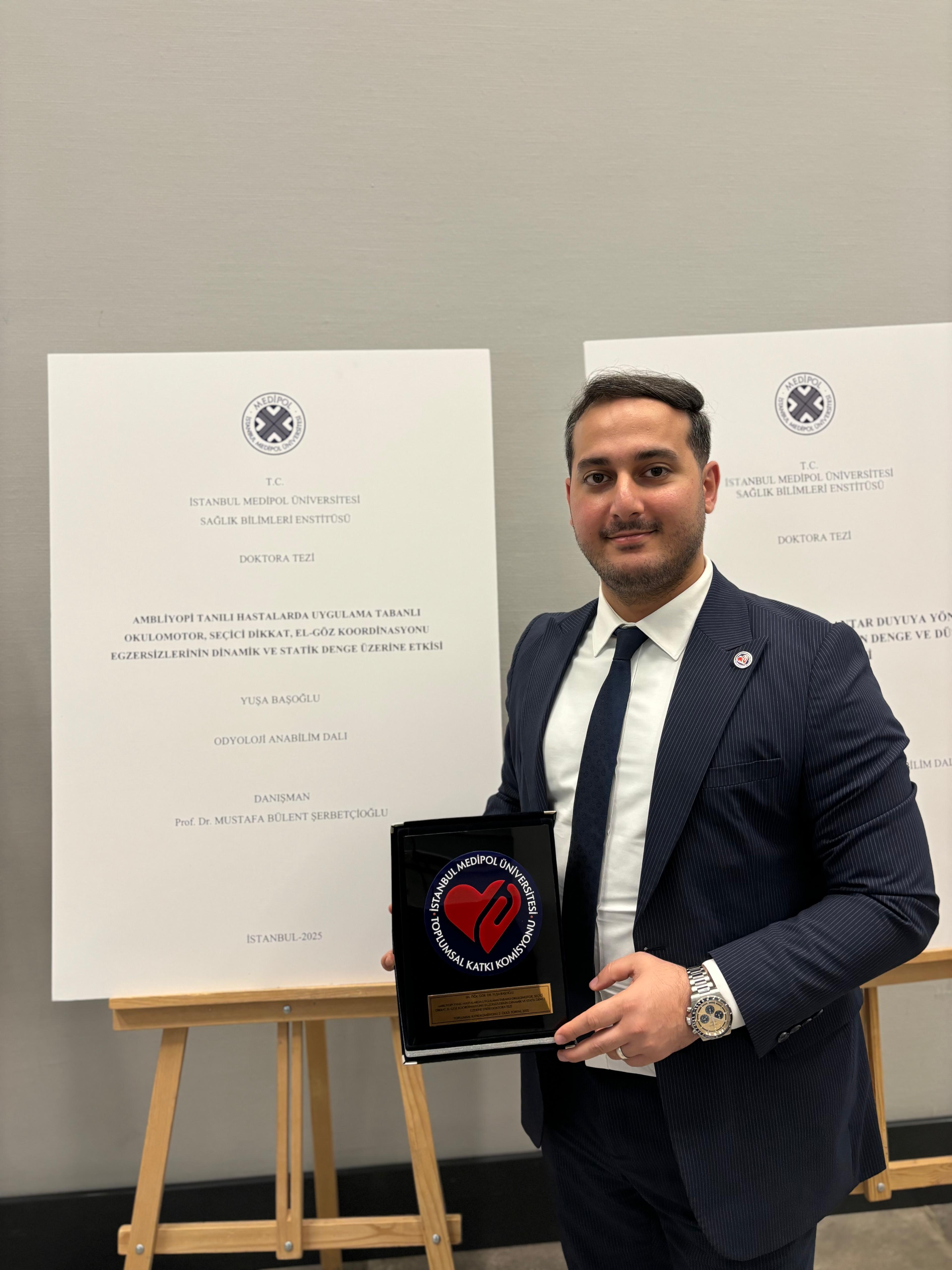 İstanbul Medipol Üniversitesi Toplumsal Katkı Komisyonu tarafından düzenlenen ödül töreninde, İstanbul Medipol Üniversitesi Odyoloji Bölümü Öğretim Görevlisi Dr. Yuşa Başoğlu’nun “Ambliyopi tanılı hastalarda uygulama tabanlı okulomotor, seçici dikkat ve el-göz koordinasyonu egzersizlerinin dinamik ve statik denge üzerine etkisi” başlıklı çalışması ödüle layık görülmüştür.
